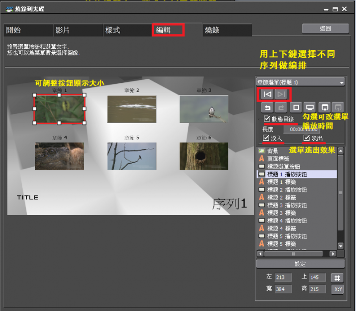 4_2_燒錄到光碟_編輯頁面_修改不同序列_時間_進出效果_按鈕大小