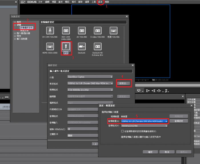 說明:EDIUS PRO 7剪輯軟體要使用外接 USB 錄音裝置來進行線上錄音時,要如何設定裝置進到軟體中?