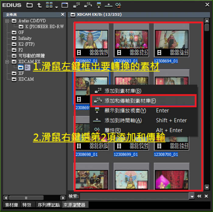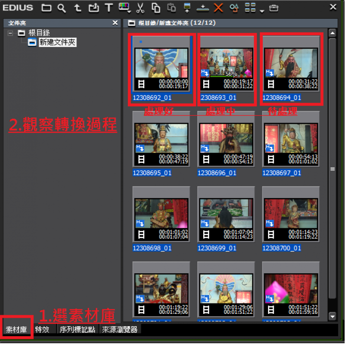 3. 當來源瀏覽器匯轉至素材庫過程中,建議待其素材庫內每一圖框運算處理完成所以圖框處理過再拉進時間軸編輯才會順暢。