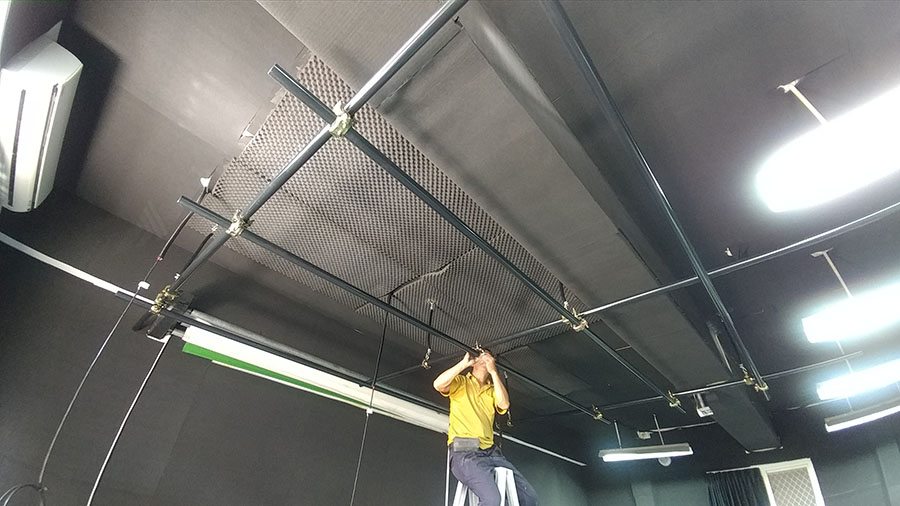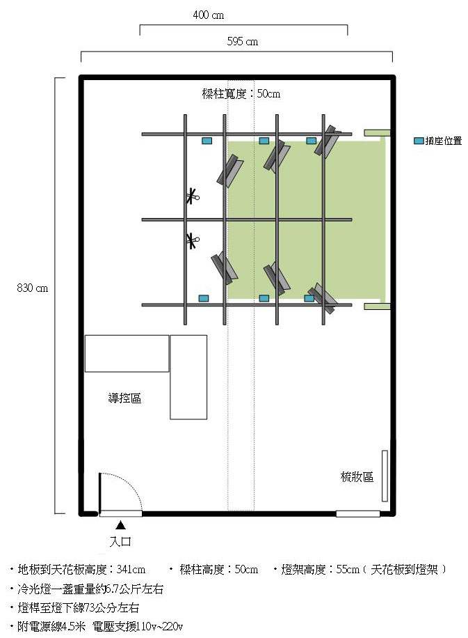 地點:綜合教學大樓攝影棚 時間:2018~2020 規格: 訂製攝影棚燈架及移動式綠去背腳架組﹝依圖施工﹞ a.棚架: 1.5" 圓鐵管面噴消光黑漆 400 cm x7支_依設計圖含施工 1SET ‧2米彈簧手/含安全索*2、C型勾*1 2SET (無彈片/承重約10公斤) ‧施工架設、線材及設定費 1PCS ‧6組電源插座材料電工費 1PCS