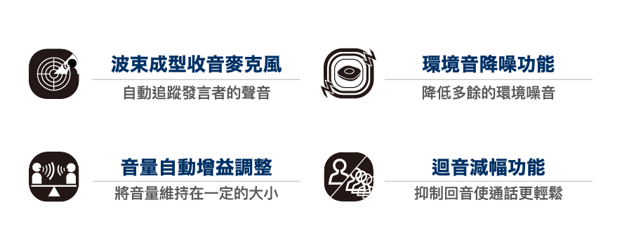| 三.音量自動增益調整 將音量維持在一定的大小 自動增益功能會根據發言者與麥克風的距離及聲音音量調整音量差異, 以固定音量將聲音傳送給通話對象。 |