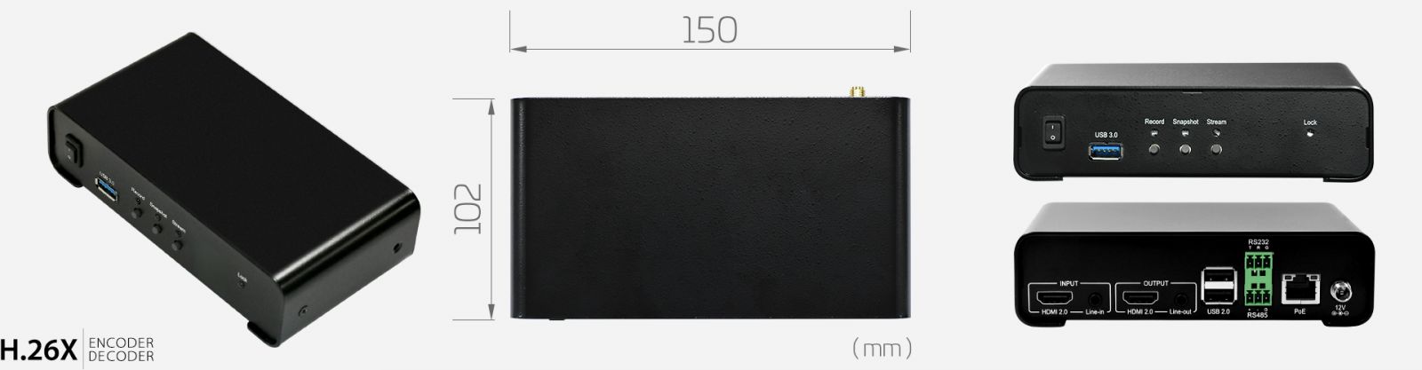 | Video Feature 視頻功能 | H.265( HEVC ) / H.264 / AVC, Baseline / Main / High Profile Configurable Bit Rate Up to 64Mbps Supported Input / Output Resolutions : 3840×2160p@60/50fps 3840×2160p@30/25/24fps 1920×1080p@60/50fps 1920×1080p@30/25/24fps 1280×720p@60/50fps 1280×1024p@60fps 1280×960p@60fps 1024×768p@60fps 800×600p@60fps 640×480p@60fps 720×480p@60fps 720×576p@50fps |